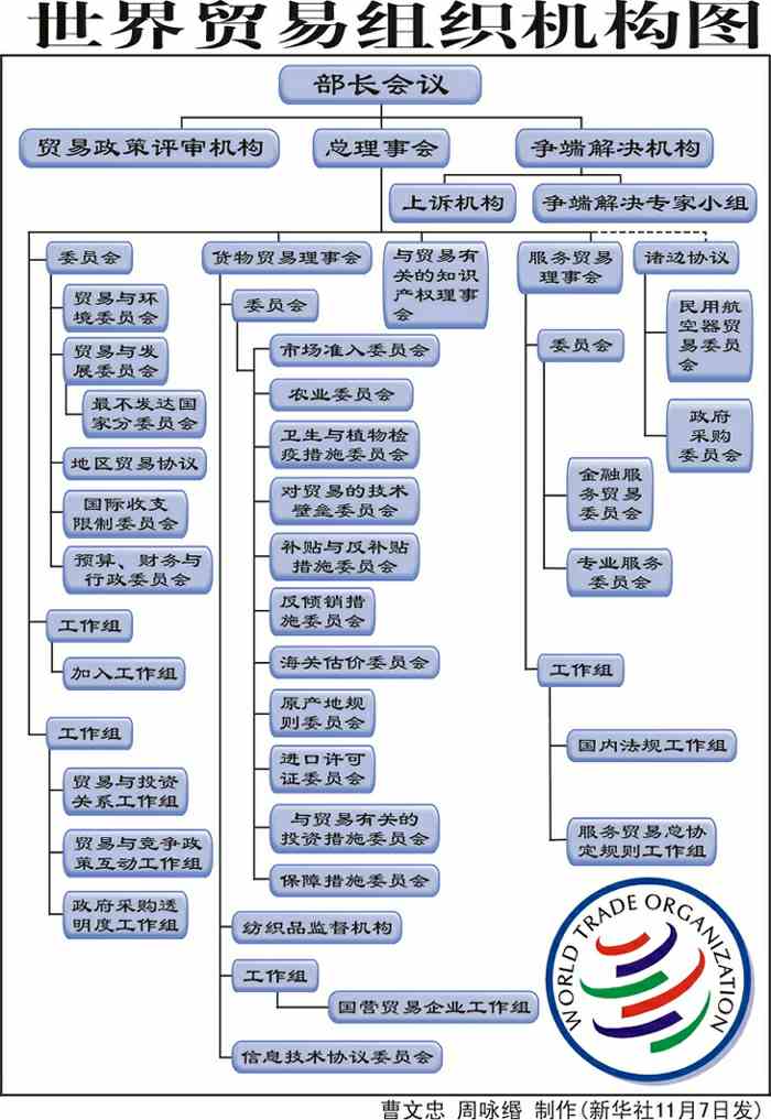 世贸组织被认为是多边贸易体制的代表,其核心是世贸组织的各项协定。这些协定是由世界上绝大多数国家和地区通过谈判达成并签署的,已经各成员立法机构的批准。这些协定包含了国际贸易通行的法律规则,一方面保证各成员的重要贸易权利,另一方面对各成员政府起到约束作用,使它们的贸易政策保持在各方议定且符合各方利益的限度之内,这样做是为了向产品制造者和服务提供者提供帮助,并便利进出口业务的开展。 世贸组织的首要目标是帮助开展平稳、自由、公平的贸易。实现这些目标的途径包括:管理世贸组织协定、处理贸易争端、监督各国贸易政策、为发展中国家提供技术援助和培训、与其他国际组织开展合作等。 世贸组织的宗旨是:在提高生活水平和保证充分就业的前提下,扩大货物和服务的生产与贸易,按照可持续发展的原则实现全球资源的最佳配置;努力确保发展中国家,尤其是最不发达国家在国际贸易增长中的份额与其经济需要相称;保护和维护环境。世界贸易组织的目标是建立一个完整的、更具有活力的和永久性的多边贸易体制。与关贸总协定相比,世界贸易组织管辖的范围除传统的和乌拉圭回合确定的货物贸易外,还包括长期游离于关贸总协定外的知识产权、投资措施和非货物贸易(服务贸易)等领域。世界贸易组织具有法人地位,它在调解成员争端方面具有更高的权威性和有效性。世界贸易组织的基本原则是非歧视贸易原则,包括最惠国待遇和国民待遇条款;可预见的和不断扩大的市场准入程度,主要是对关税的规定;促进公平竞争,致力于建立开放、公平、无扭曲竞争的“自由贸易”环境和规则;鼓励发展与经济改革。世贸组织的基本职能有:管理和执行共同构成世贸组织的多边及诸边贸易协定;作为多边贸易谈判的讲坛;寻求解决贸易争端;监督各成员贸易政策,并与其它同制订全球经济政策有关的国际机构进行合作。世贸组织的目标是建立一个完整的、更具有活力的和永久性的多边贸易体制。与关贸总协定相比,世贸组织管辖的范围除传统的和乌拉圭回合确定的货物贸易外,还包括长期游离于关贸总协定外的知识产权、投资措施和非货物贸易(服务贸易)等领域。世贸组织具有法人地位,它在调解成员争端方面具有更高的权威性和有效性。 部长级会议是世贸组织的最高决策权力机构,一般两年举行一次会议,讨论和决定涉及世贸组织职能的所有重要问题,并采取行动。部长级会议的主要职能是:任命世贸组织总干事并制定有关规则;确定总干事的权力、职责、任职条件和任期以及秘书处工作人员的职责及任职条件;对世贸组织协定和多边贸易协定做出解释;豁免某成员对世贸组织协定和其它多边贸易协定所承担的义务;审议其成员对世贸组织协定或多边贸易协定提出修改的动议;决定是否接纳申请加入世贸组织的国家或地区为世贸组织成员;决定世贸组织协定及多边贸易协定生效的日期等。下设总理事会和秘书处,负责世贸组织日常会议和工作。世贸组织成员资格有创始成员和新加入成员之分,创始成员必须是关贸总协定的缔约方,新成员必须由其决策机构——部长会议以三分之二多数票通过方可加入。 |