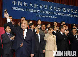![]() 2001年12月11日,中国正式加入世界贸易组织,成为其第143个成员。图为2001年11月11日,中国外经贸部部长石广生在卡塔尔首都多哈举行的中国加入世贸组织议定书签字仪式上举杯庆贺。 |